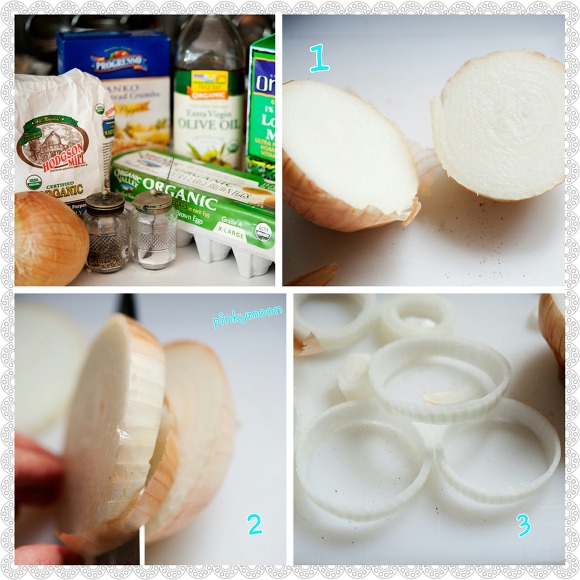 양파 한개 (큰것으로), 달걀 (쓰시고 싶으신 만큼), 밀가루, 빵가루, 우유, 타바스코 소스 (핫소스), 올리브 오일,소금, 후추