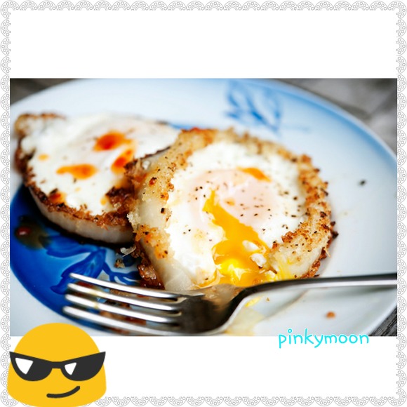 12. 쨘~~~ 먹음직 스럽게 되었어요. 이쁜 접시에 담아 두시구요. 그 위에 타바스코 소스(핫소스)를 뿌려서 드세요. 조금 색다른 달걀 요리~ 어떠세요? 양파의 아싹하고 살짝 익히면 단맛이 나고 거기에 달걀의 부드러움과 타바스코의 약간 매운 맛이 조화를 이루는 맛을 보실수 있습니다. 여기에 베이컨을 같이 구어서 올리면, 색다른 아침 식사로 에그링도 괜찮습니다.